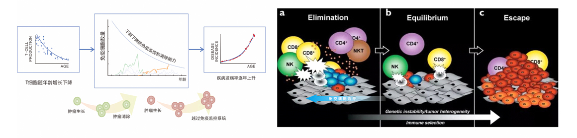 逃逸狀態(tài):隨著年齡增長,NK細(xì)胞、CTL細(xì)胞和DC細(xì)胞的數(shù)量和功能逐漸下降,突變細(xì)胞的基因組極不穩(wěn)定,不斷產(chǎn)生新的突變,導(dǎo)致原癌基因激活、抑癌基因失靈,分泌細(xì)胞因子抑制免疫細(xì)胞的功能,免疫細(xì)胞不能識(shí)別和清除突變細(xì)胞,突變細(xì)胞快速生長,發(fā)展成腫瘤患者。