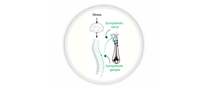 在急性應(yīng)激狀態(tài)下,交感神經(jīng)高度激活,釋放出大量去甲腎上腺素,導(dǎo)致毛囊的黑色素干細(xì)胞MeSC迅速開始增殖,并很快分化,并最終沿著毛囊遷移到別處,黑素細(xì)胞的儲庫不可逆轉(zhuǎn)地枯竭,毛發(fā)開始變白。