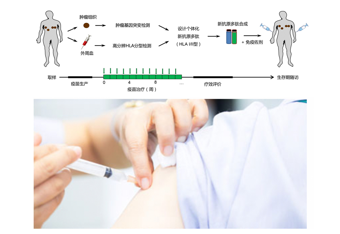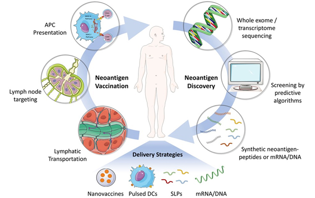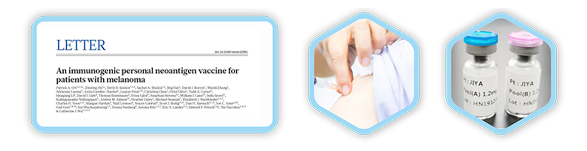 明確了患者腫瘤細胞的基因突變和HLA后,經(jīng)過生物信息學分析篩選出結(jié)合能力最強的數(shù)種肽段作為腫瘤新抗原(Neoantigens),在實驗室合成腫瘤新抗原,聯(lián)合佐劑一起注射到患者體內(nèi),誘導產(chǎn)生靶向腫瘤新抗原的特異性T細胞來殺滅腫瘤,該技術(shù)2019年被《麻省理工科技評論》評為全球十大突破性技術(shù)之一。