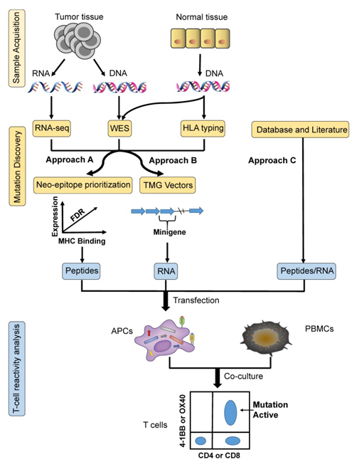 提取患者腫瘤細胞及正常細胞的DNA,進行外顯子基因組測序(Whole-exomesequencing,WES)找出腫瘤細胞發(fā)生的基因突變。提取患者腫瘤細胞的RNA,進行RNA測序(RNA-Seq)確認這些突變的基因確實在腫瘤細胞中有所表達。提取患者正常組織進行HLA測序,確認遞呈腫瘤抗原到細胞表面的MHC分子(在人類簡稱HLA)。